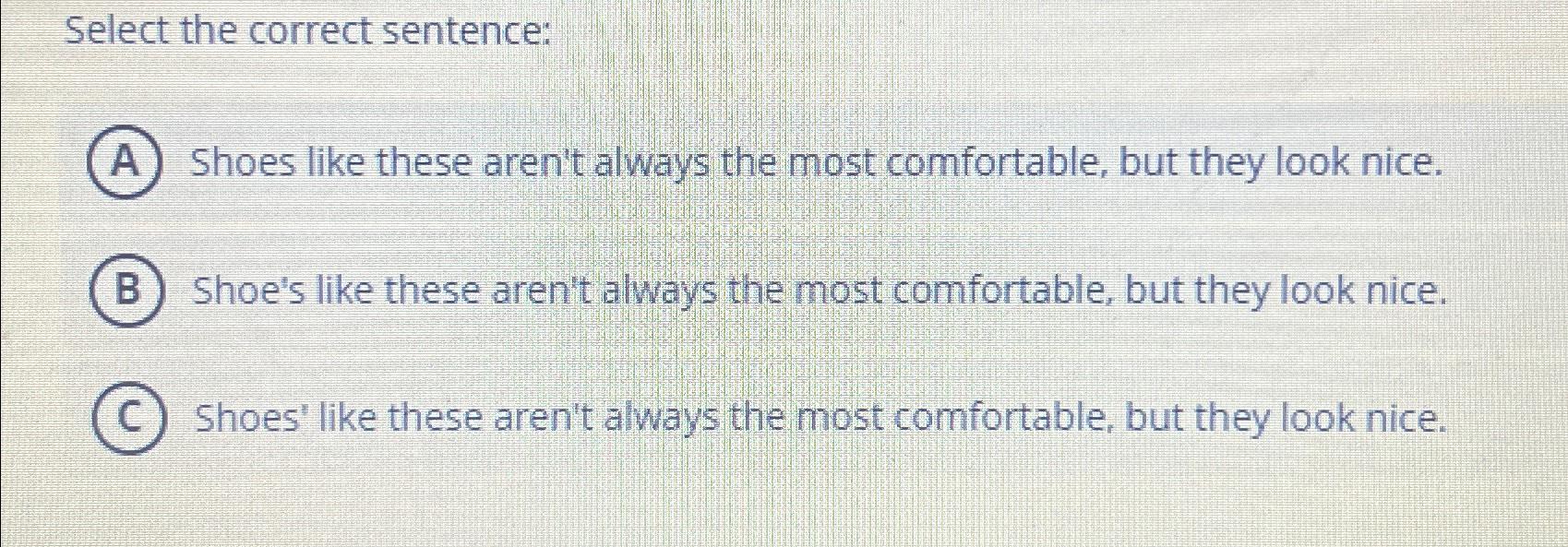 Solved Select the correct sentenceShoes like these aren't Use Of Shoe In Sentence How to connect “shoe” with other words to make correct english sentences. Learn collocations of shoe with free vocabulary lessons. examples of 'shoe' in a sentence. examples of shoe in a sentence, how to use it. learn how to use shoe using many example sentences. He took off his shoes and. learn how to use shoe. Use Of Shoe In Sentence.